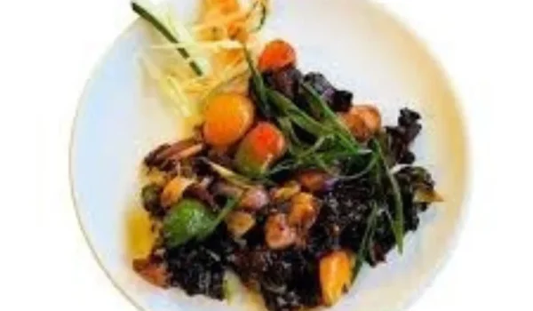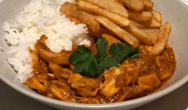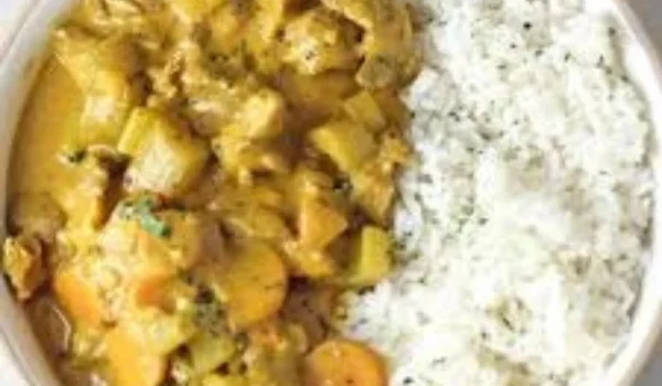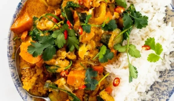 Vegetarian. Savor a delightful mix of seasonal vegetables in a rich curry, served with fragrant rice.