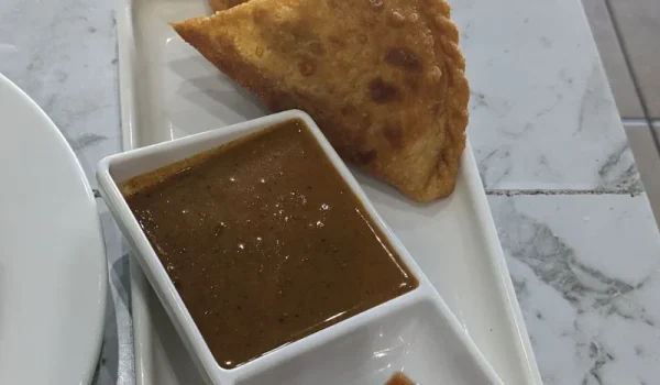 Two pieces of flaky triangles filled with savoury goodness, best enjoyed with tangy tomato chutney.
