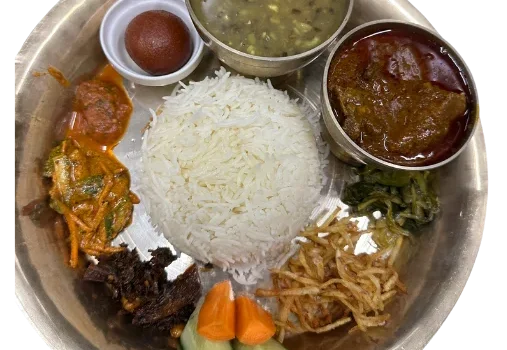 Khaja set is a Nepali meal that consists of a variety of dishes, including chiura, aalu and chwela.